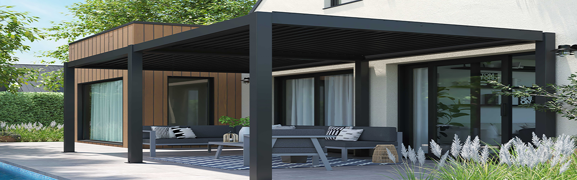 Underhållsfri pergola med pulverlakerad aluminium.